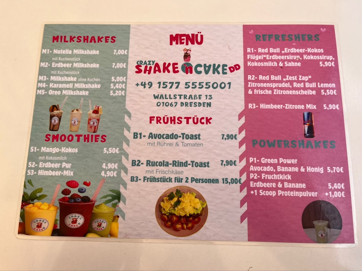 Welcome to Crazy Shake In Cake, a charming café located at Wallstr. 13, 01067 Dresden, Germany. Here, the atmosphere is warm and inviting, making it a perfect spot for relaxing or socializing. The menu offers an exquisite array of breakfast options, including the B1 Avocado Toast with scrambled eggs and tomatoes for €9.90 and the B2 Rucola Rind Toast with cream cheese for €9.50. For coffee enthusiasts, a selection of specialties like Cappuccino and Latte Macchiato is available, starting from €2.30.